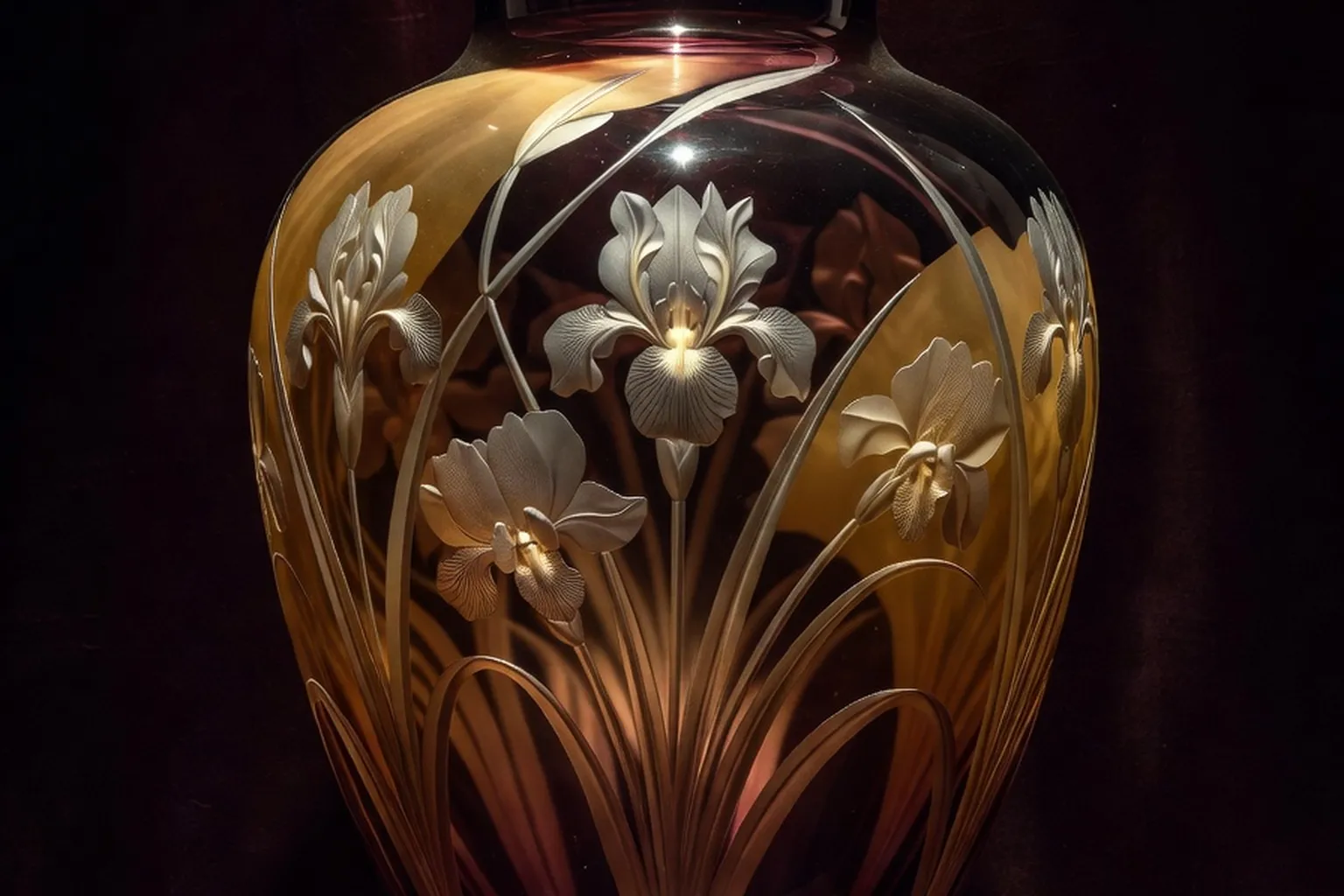 La specialite de Galle est le verre multicouche grave a l’acide, technique qu’il perfectionne a partir de 1889. Le procede consiste a superposer plusieurs couches de verre colore, puis a les sculpter a l’acide fluorhydrique pour faire apparaitre des motifs en bas-relief polychrome. Les vases obtenus jouent sur la transparence, les degrades, les ombres internes. Aucune autre verrerie europeenne ne maitrise ce niveau de complexite chromatique.